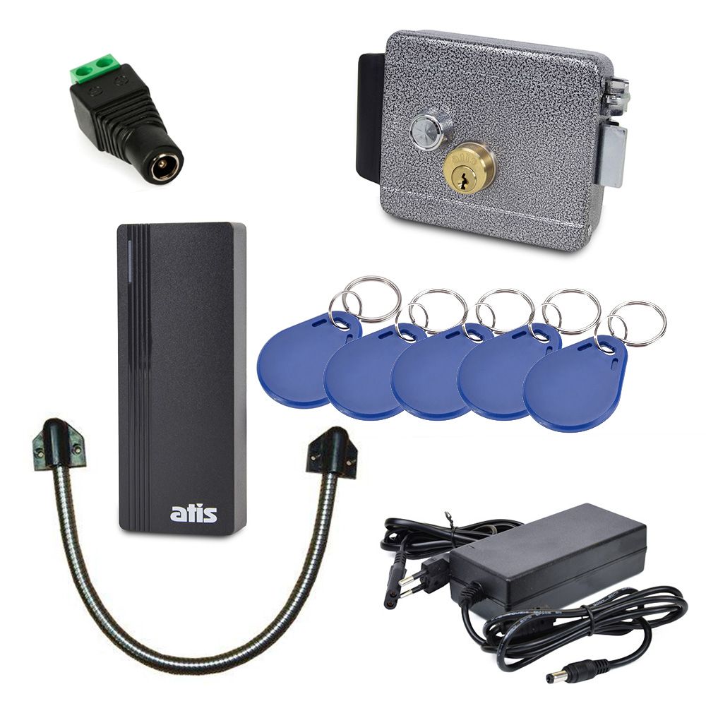 У комплект контролю доступу для тамбурних дверей входить: електромеханічний замок ATIS Lock G для контролю доступу, контролер із вбудованим зчитувачем EM-Marine вологозахищений ATIS ACPR-07 EM-W (black), брелок RFID KEYFOB EM Blue 5 шт., блок живлення Full Energy BGP-123Lite 12 В / 3 А, гнучкий перехід ПМ-2 (чорний), роз'єм-power ATIS під затискач (male)