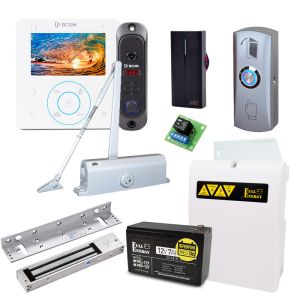 Комплект контролю доступу №001 містить: комплект відеодомофон+виклична панель, електромагнітний замок і монтажний куточок до нього, дотягувач дверей, автономний контролер-зчитувач, кнопка виходу, картка доступу - 20 шт, блок безперебійного живлення, акумулятор, контролер bs-1.