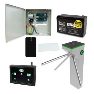 Комплект контролю доступу №006 включає: турнікет, мережевий контролер, 2 зчитувача, 50 карт доступу, 2 акумулятора, пульт для керування турнікетом.