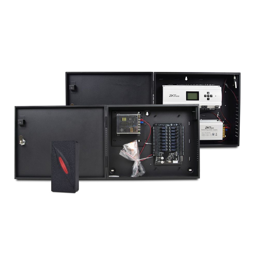 Комплект ZKTeco для обмеження доступу у ліфт включає: контролер керування ліфтами у боксі ZKTeco EC10 Package B, плата розширення для 16 поверхів у боксі ZKTeco EX16 Package A, вологозахищений зчитувач EM-Marine, Mifare і NFC ZKTeco KR310, програмне забезпечення ZKBS-ELE-ONLINE-S1 для 1-10 контролерів EC10
