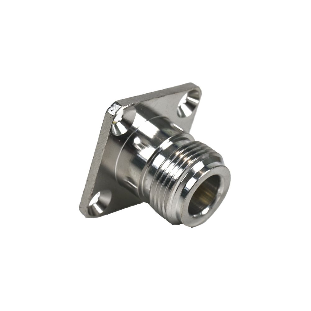 Фланцевий роз'єм N-Type розміром 25x25 мм забезпечує надійне з'єднання у високочастотних системах. Підходить для монтажу на панелі за допомогою чотирьох гвинтів і розрахований на хвильовий опір 50 Ом. Ідеальний для телекомунікаційних і радіочастотних застосувань.