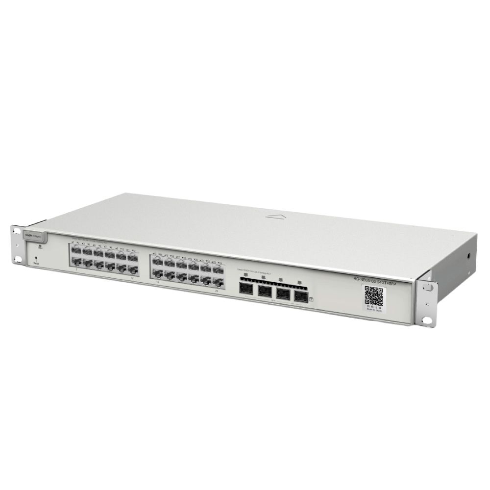 Ruijie Reyee RG-NBS5100-24GT4SFP гігабітний 28-портовий керований комутатор рівня 2+ без підтримки PoE. Комутатор має 24 порти Gigabit Ethernet з підтримкою передавання даних зі швидкістю до 1 Гбіт/с і 4 SFP-порти для під'єднання оптичних модулів. Пропускна здатність: 56 Гбіт/с. Швидкість пересилання: 42 Мбіт/с. Таблиця MAC-адрес: 16000. Захист порту від грозового перенапруження: 6 кВ. Електроживлення: 100-240 В змінного струму, 1,5 A. Енергоспоживання: ≤ 28 Вт