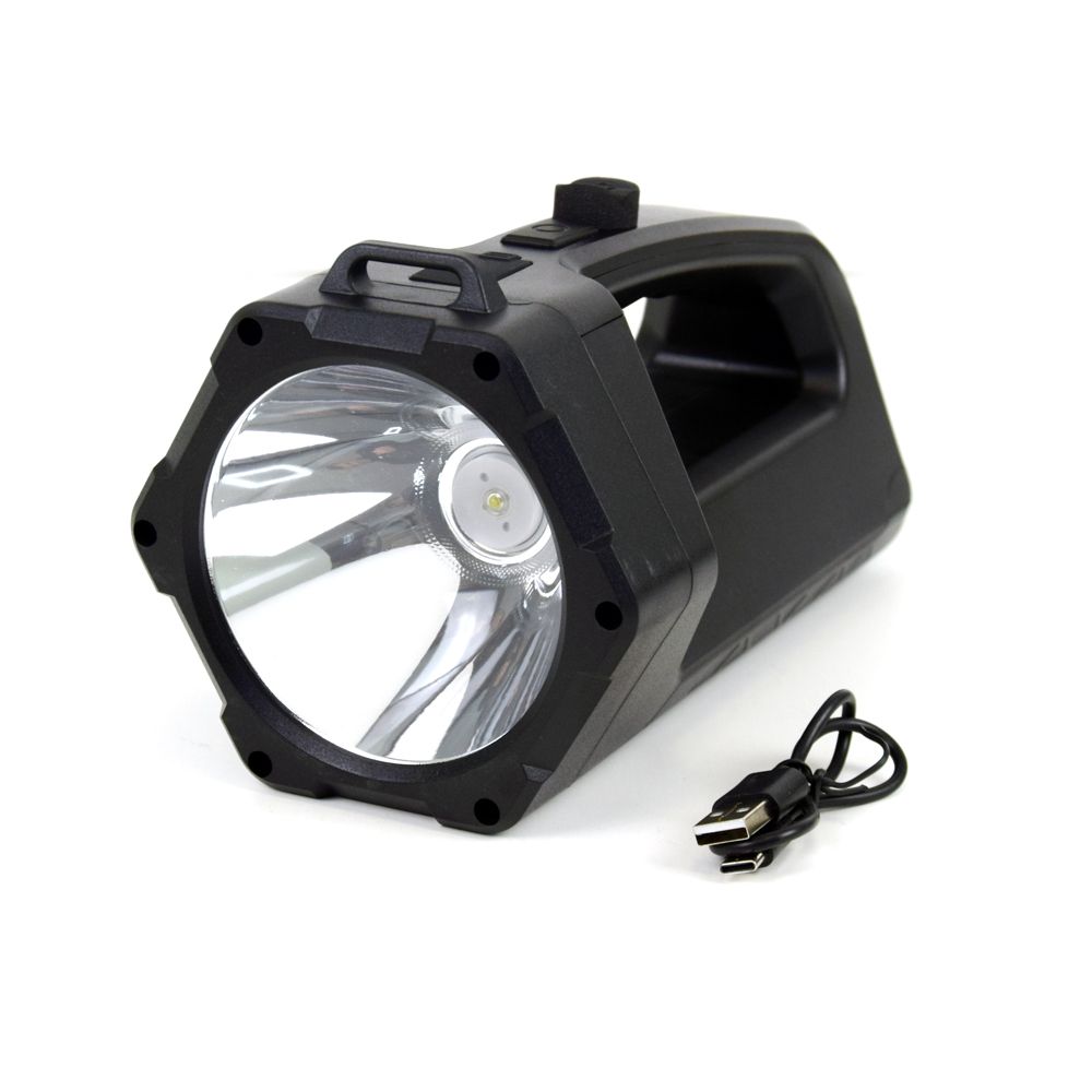Ручний ліхтарик з номінальною потужністю 5 Вт, що перезаряджається. Яскравість: 230 лм. Дальність променя: 350 м. Вбудована батарея 2 х 18650/1200мАг. Зарядний порт Type-C. Ступінь захисту: IP43. Матеріал: ABS. Габаритні розміри: 208 х 120 х 117 мм. Вага: 325 г.