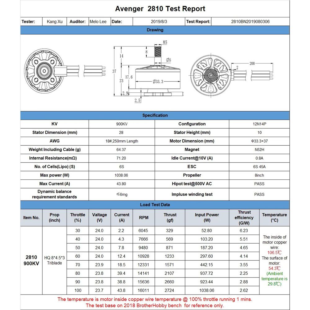 BrotherHobby Avenger 2810 900KV потужний безколекторний двигун для FPV квадрокоптерів, що забезпечує тягу до 2750 г. Працює на живленні від 23.8 В, витримує піковий струм до 33.8 А і розвиває максимальну потужність до 804.44 Вт. Двигун має міцний вал з титанового сплаву діаметром 5 мм і ротор з дуговими магнітами N52H для стабільної роботи. Корпус з алюмінію Al 7075 і японські підшипники NMB підвищують надійність і довговічність пристрою. Вага двигуна 76.5 г, що робить його легким і зручним для встановлення на квадрокоптери.