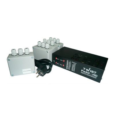Комплект підсилювачів для чотирьохканальної передачі відеосигналу TWIST PwA4-HD використовує технологію PwA для передачі чотирьох чорно-білих або кольорових композитних відеосигналів формату D1, 960H, HD TVI, HD CVI, AHD і живлення відеокамер по кабелю вита пара UTP, FTP, SFTP, ТППЕП і аналогічного на відстань до 500 м. Вбудований грозозахист.