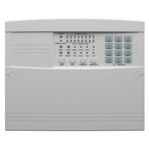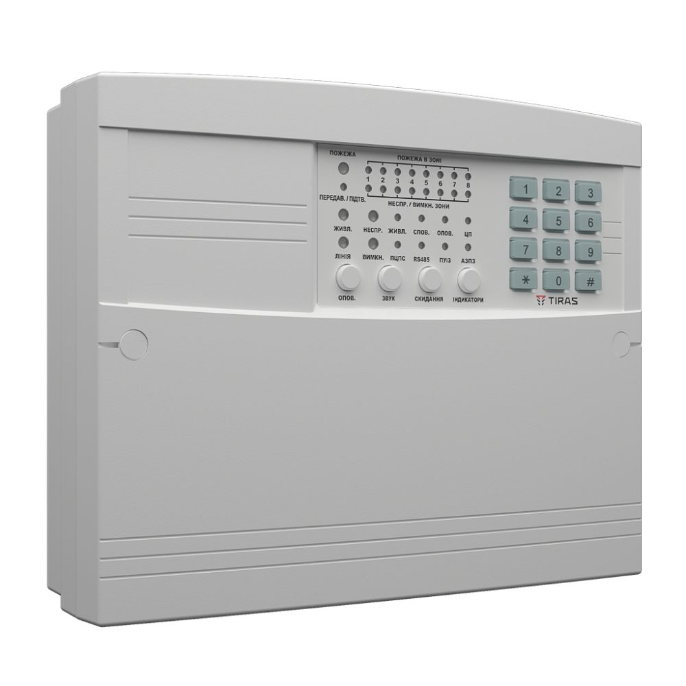 Пожежний приймально-контрольний прилад на 8 зон неадресної протипожежної системи Тірас-П від українського виробника TIRAS Technologies. Сертифікат відповідності EN54. Прилад пожежної сигналізації, призначений для реалізації надійної системи пожежної безпеки на середніх об’єктах (офіси, магазини, банки, складські приміщення тощо). Має в базі: 8 зон (шлейфів), 32 сповіщувача у кожній зоні, 3 входи/виходи. Особливості: час реакції зони на тривогу менше 0,4 с, можливість реалізації системи пожежогасіння, 3 алгоритми верифікації спрацювання сповіщувачів, програмування з клавіатури чи з ПК, інтерфейс Touch Memory. Живлення: 220В, резервне живлення: свинцево-кислотні АКБ на 7 або 9 А*год; колір білий. Гарантія 36 місяців.