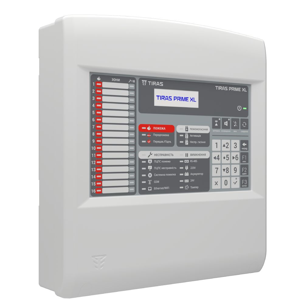 Центральний пристрій протипожежної системи Tiras PRIME XL від українського виробника TIRAS Technologies. Сертифікований за EN54, розрахований на великі об’єкти. Має 32 зони пожежної сигналізації, до 32 сповіщувачів у кожній зоні, 4 релейні та 4 транзисторні виходи. Особливості: сценарії автоматики, інтуїтивна панель управління, журнал на 1000 подій, режим День/Ніч, 2 порти RS-485 (до 16 пристроїв). Живлення: 220 В, резервне – 2 свинцево-кислотні або LiFePO4 АКБ 7–8 А·год; колір сірий. Гарантія 36 місяців.