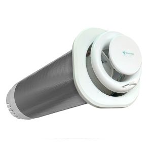 Рекуператор для вентиляції приміщення площею 70 м². Ефективність рекуперації 93%, Продуктивність 185 м³/год, Потужність 26 Вт, Рівень шуму 32 дБ, Ручний клапан перекриття потоків, Труба довжиною 525-1000 мм, діаметром 200 мм