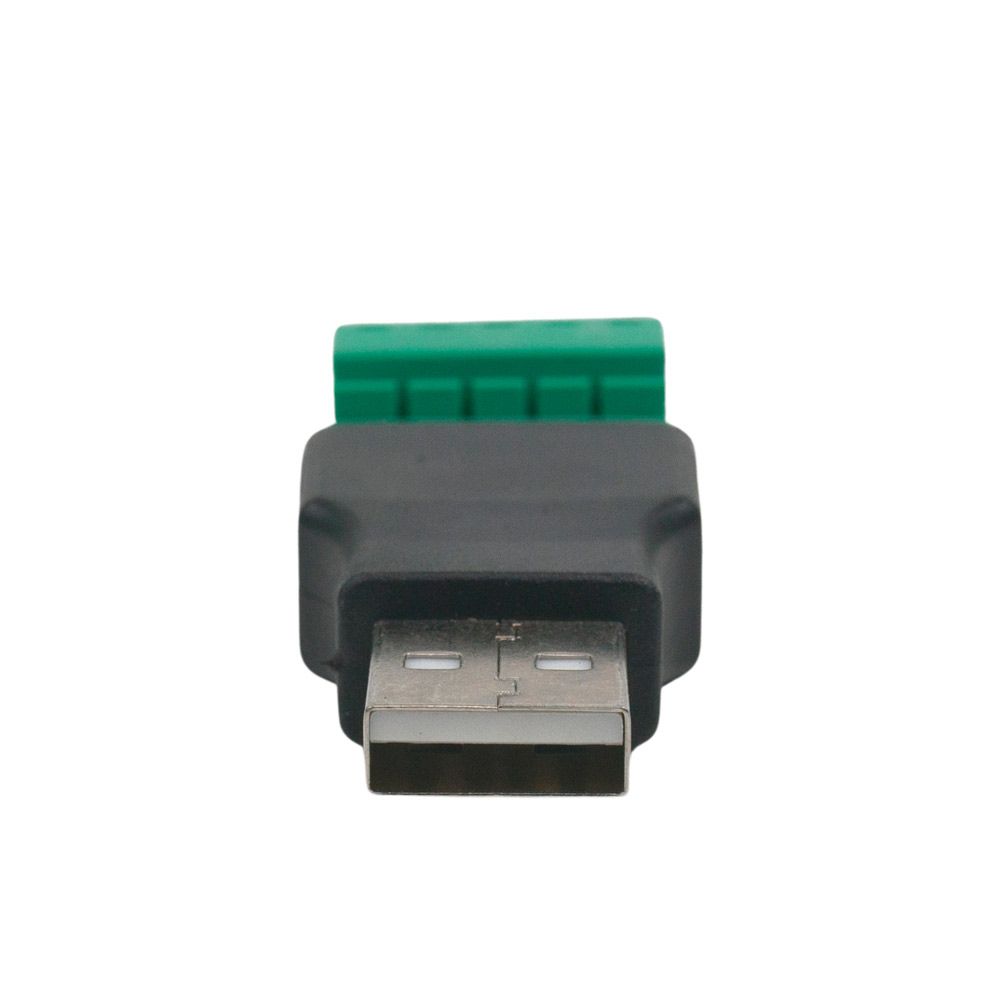 Роз'єм USB під затискач (male) (тато) для кабелю UTP/FTP. З одного боку USB - з іншого 5 клем. USB: 2.0. З'єднання сухий контакт. Пластиковий корпус. Довжина: 53 мм