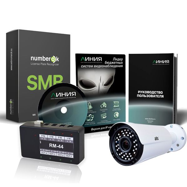 Комплект розпізнавання автомобільних номерів N.OK-1.1.1 включає: ПО-детектор номерних знаків NumberOk SMB1 All, IP-відеокамеру з роздільною здатністю Full HD (1920x1080), софт Line IP для роботи з відеокамерами, модуль управління релейних входів / виходів, PoE- INJECTOR