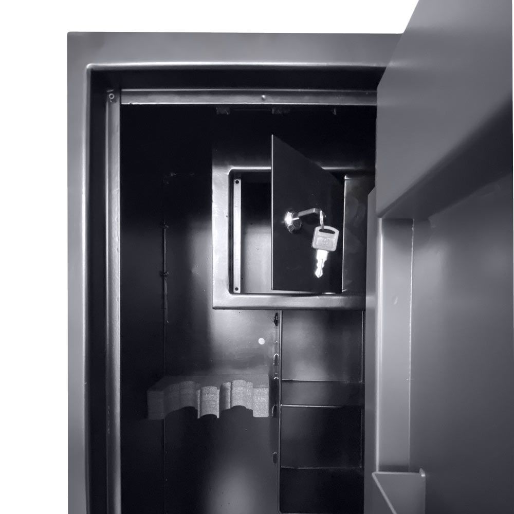 Сейф для зброї. Тип замку: ключовий сейфовий замок; Приварена полиця: Є; Кількість полиць: 2 шт.; Трейзер: Є; Кількість рушниць: 2; Розміри 350 х 1230 х 250мм; Вага: 37.5 кг