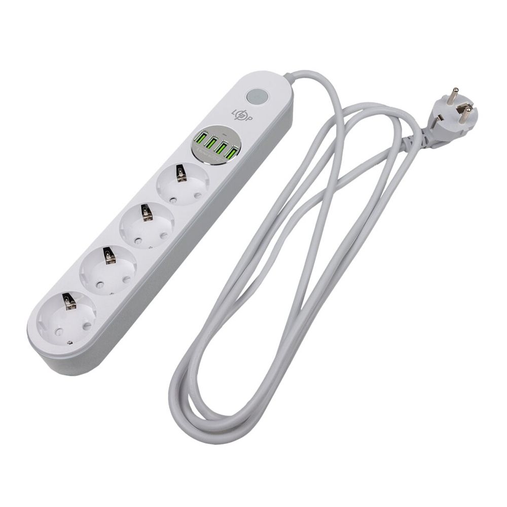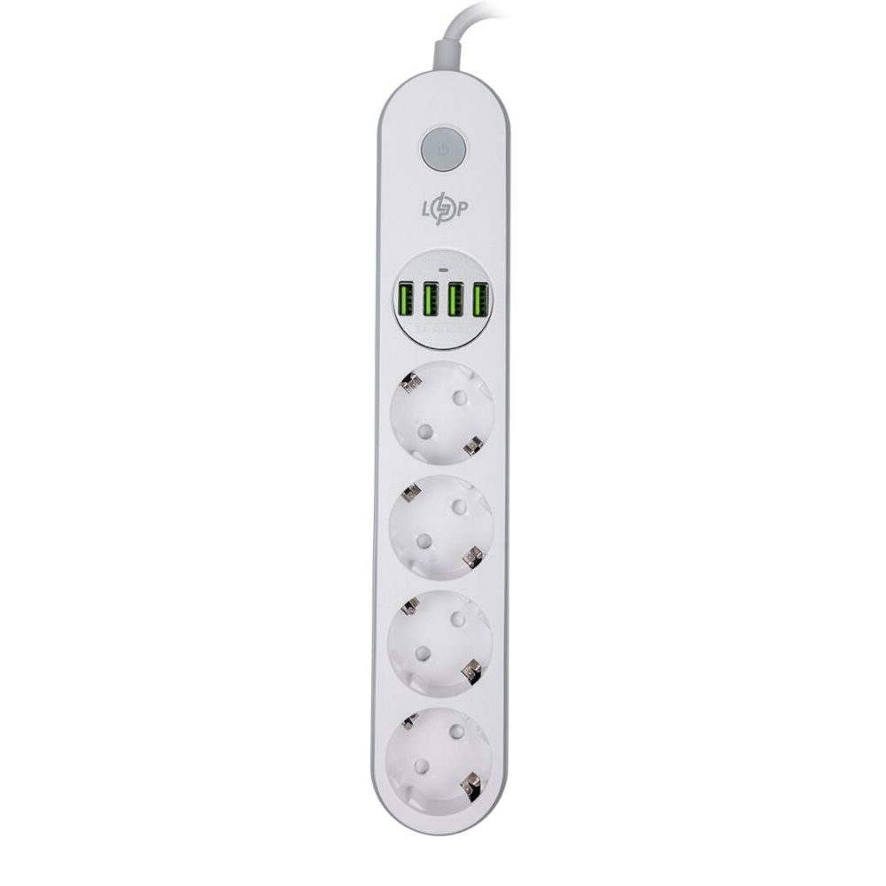 Мережевий фільтр LogicPower F24U4 оснащений 4 розетками 220В і 4 USB-портами (5В/3.4A, 17Вт) для під'єднання та заряджання пристроїв. Підтримує максимальну потужність 2500Вт і струм до 10А. Має захист від перегріву, перевантаження за струмом і короткого замикання. Довжина кабелю - 2 м, колір - білий. Компактні розміри: 291x52x40 мм. Оснащений вимикачем для зручності використання.