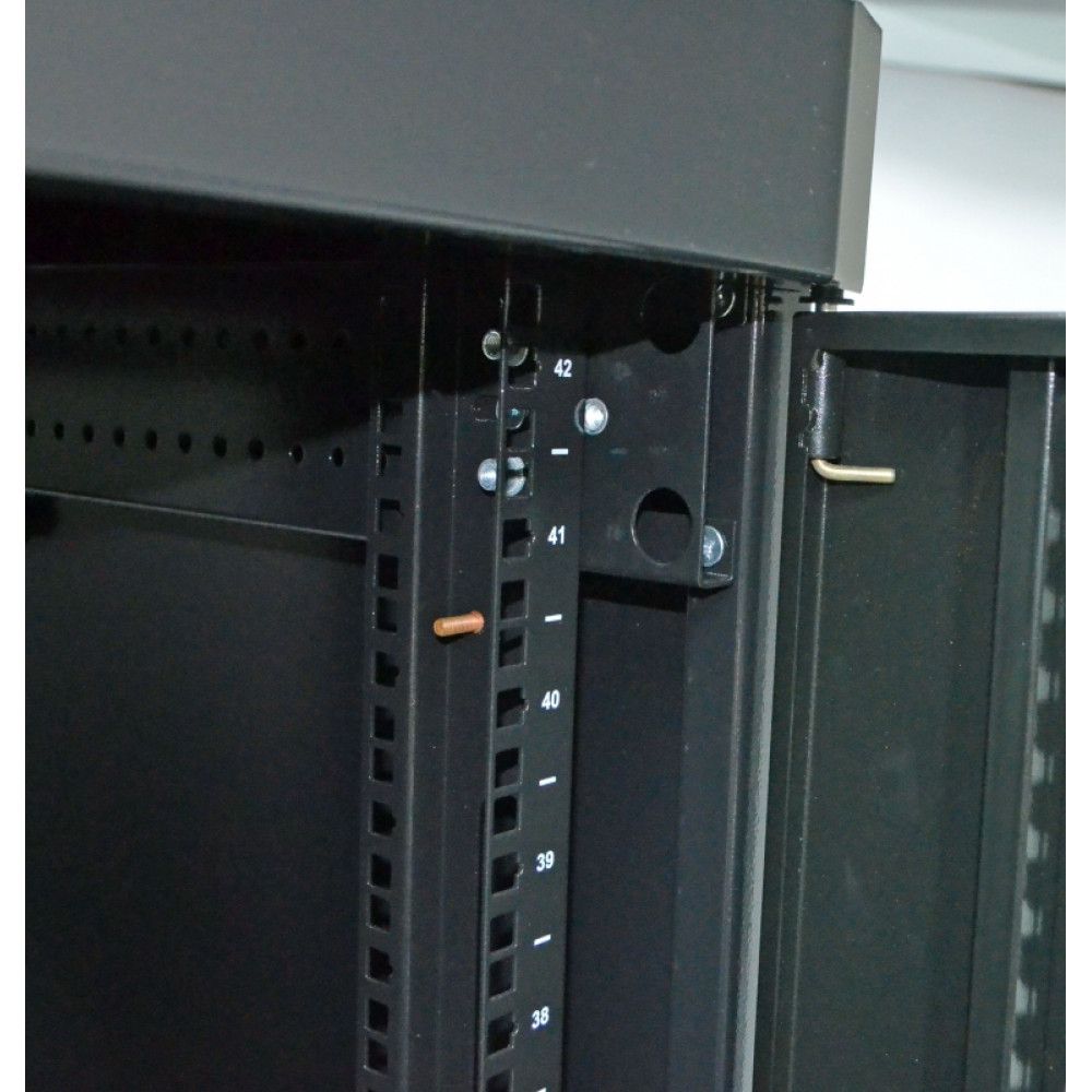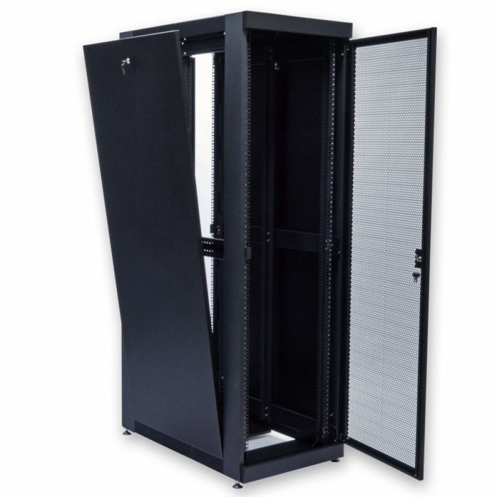 Серверна шафа посилена з перфорованими дверима (66%) для розміщення електронного та/або електротехнічного обладнання. Робоча висота: 45U. Товщина металу деталей корпусу: 1 - 2 мм. Максимальне навантаження: 800 кг. Стандарт: 19". Максимальна робоча глибина для встановлення обладнання: 1055 мм. Колір чорний.