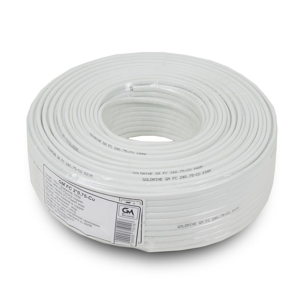 Кабель ШВВП GoldMine GM FC 2*0.75-CU для внутрішньої прокладки, зовнішня оболонка виготовлена із застосуванням ПВХ (полівінілхлориду). 2 жили по 0.75 мм. Без екранування. Матеріал провідника: мідь (Cu). Зовнішня оболонка: полівінілхлорид для внутрішньої прокладки. Опір: 2 Ом x 100 м. Колір: білий. Напруга: до 400 В. Бухта: 100 м