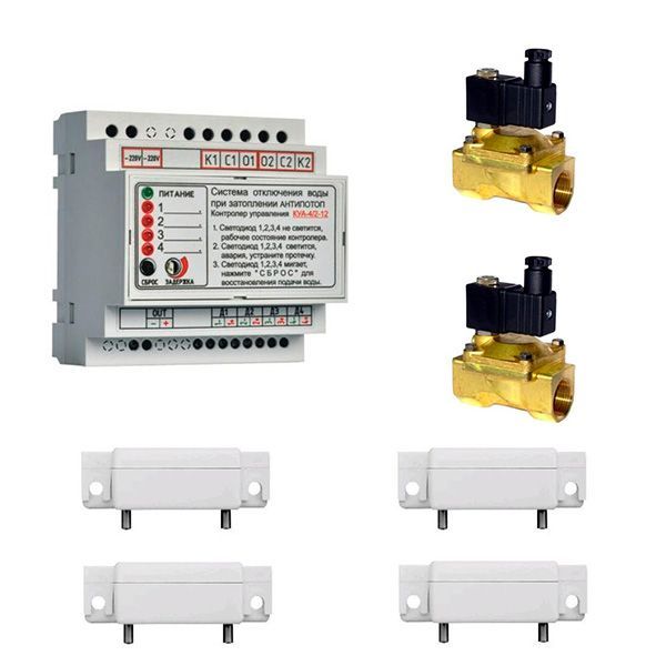 Комплект антизатоплення АНТИПОТОП - система запобігання протікання води в квартирах, заміських будинках, підприємствах. У комплекті: контролер керування ККА4/2-12*1шт.; датчик затоплення Akvarate*4шт.; клапан електромагнітний NO3/4"(нормально розімкнений; Ø труби 3/4")*2шт.