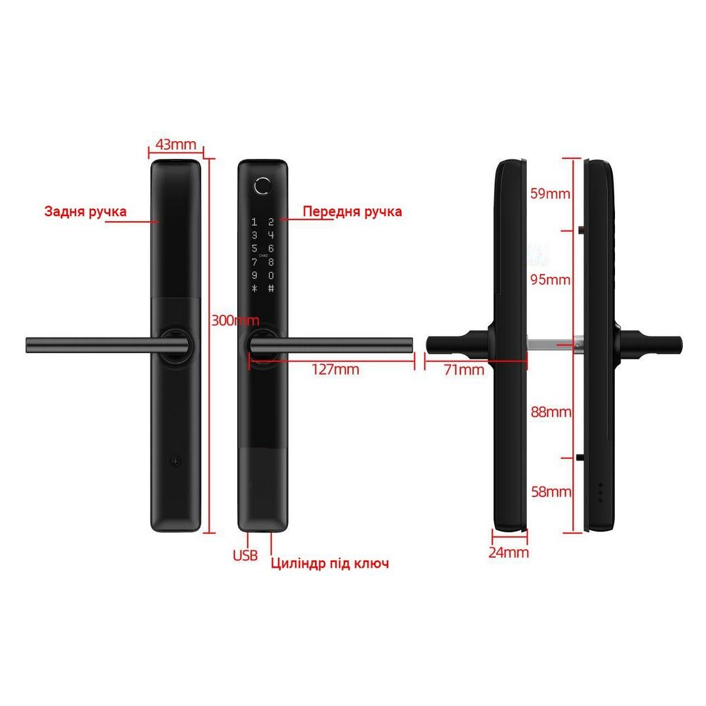 Розумний біометричний замок з Bluetooth. Способи відкриття: Bluetooth, пін-код (150), відбиток пальця (200), ідентифікатор Mifare (200), механічний ключ (2), Wi-Fi (опціонально). Електронний ключ. Автономний, працює від 4 батарейок АА. Повне керування та налаштування зі смартфона через Bluetooth. Безкоштовний мобільний додаток Android/iOS. Для дверей товщиною 35-80 мм. Врізна частина: 240×49×22 мм, бексет (дорнмас) 35 мм, Розміри накладки без ручки: 300×43×24 мм. Матеріал: сталь. Колір: чорний.