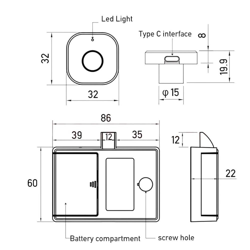 Меблевий smart-замок з доступом по відбитку пальця. Пам'ять відбитків: 20. Живлення: 3 лужні батареї типу AAA, роз'єм USB Type C для резервного живлення. LED індикатор стану. Матеріал: пластик. Товщина дверей: від 14 мм. Розміри: зовнішній блок 32 x 32 x 8 мм, замикаючий механізм 60 x 86 x 22 мм