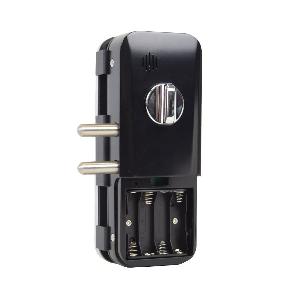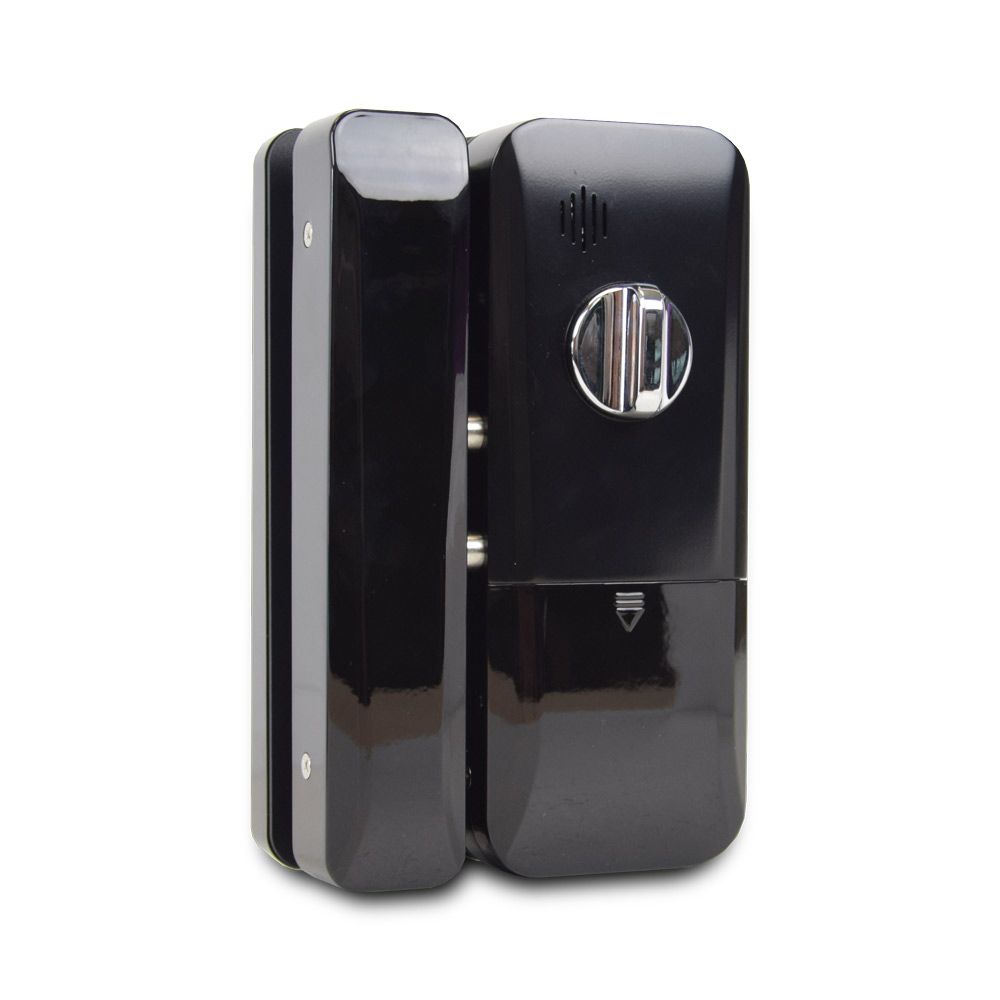 Smart замок для скляних дверей зі зчитувачем відбитка пальця і безконтактних карт Mifare. Кількість користувачів 100. Живлення 4*AA батареї (не входять до комплекту). Товщина дверей 10-12 мм. Розміри: 131х200х75 мм