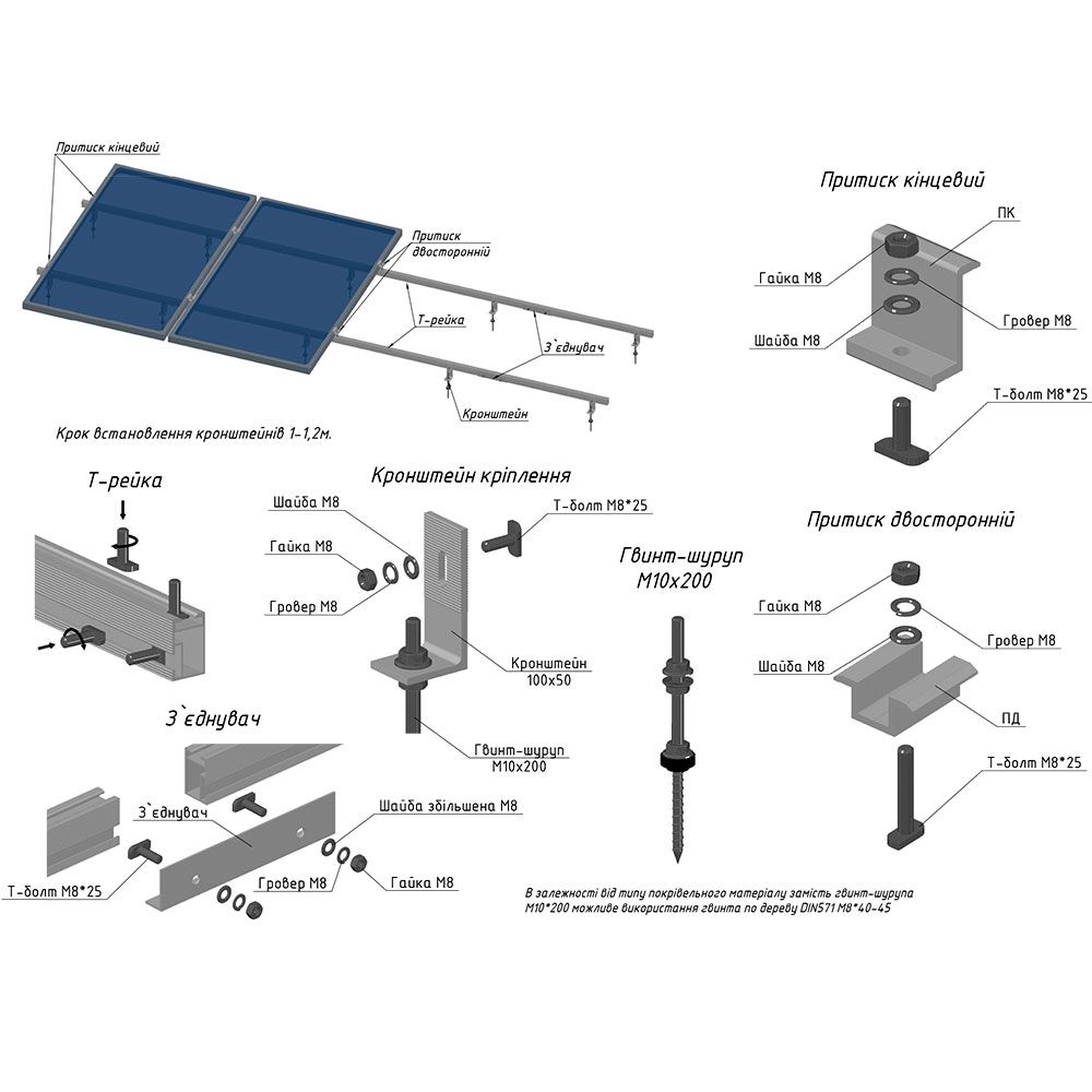 Встановлення сонячних панелей на похилий дах є одним з найпоширеніших способів встановлення сонячних панелей на дахах будівель. Матеріал: Анодований алюмінієвий профіль. Сплав: АД31 (6063) Т5. Антикорозійне покриття: АН15 (15 мікрон). Метиз: нержавіюча сталь А2. Під час проєктування проведено розрахунок максимальних вітрових/снігових навантажень. При правильному встановленні витримує максимальне значення вітрових/снігових навантажень у будь-якому регіоні України.