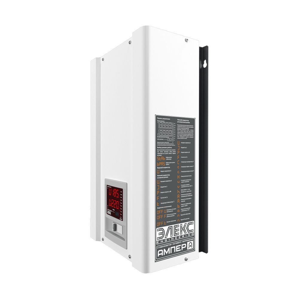 Стабілізатор напруги Елекс АМПЕР У 12-1/40 v2.1 розрахований на потужність 9 кВт і номінальний струм 40 А, забезпечує стабільну вихідну напругу 220 В з точністю ±3,5% у діапазоні стабілізації 145–275 В. Модель оснащена 12 ступенями стабілізації та симісторною схемою перемикання, що забезпечує швидку реакцію до 20 мс. ККД пристрою становить не менше 98%, власне споживання не перевищує 35 Вт, передбачені пороги відключення 100–295 В і затримка ввімкнення до 10 секунд. Працює в діапазоні частот 45–65 Гц, оснащений дворядковим LED-дисплеєм, примусовим охолодженням із двошвидкісними вентиляторами, має ступінь захисту IP20, габарити 460 × 275 × 165 мм і масу до 21 кг.