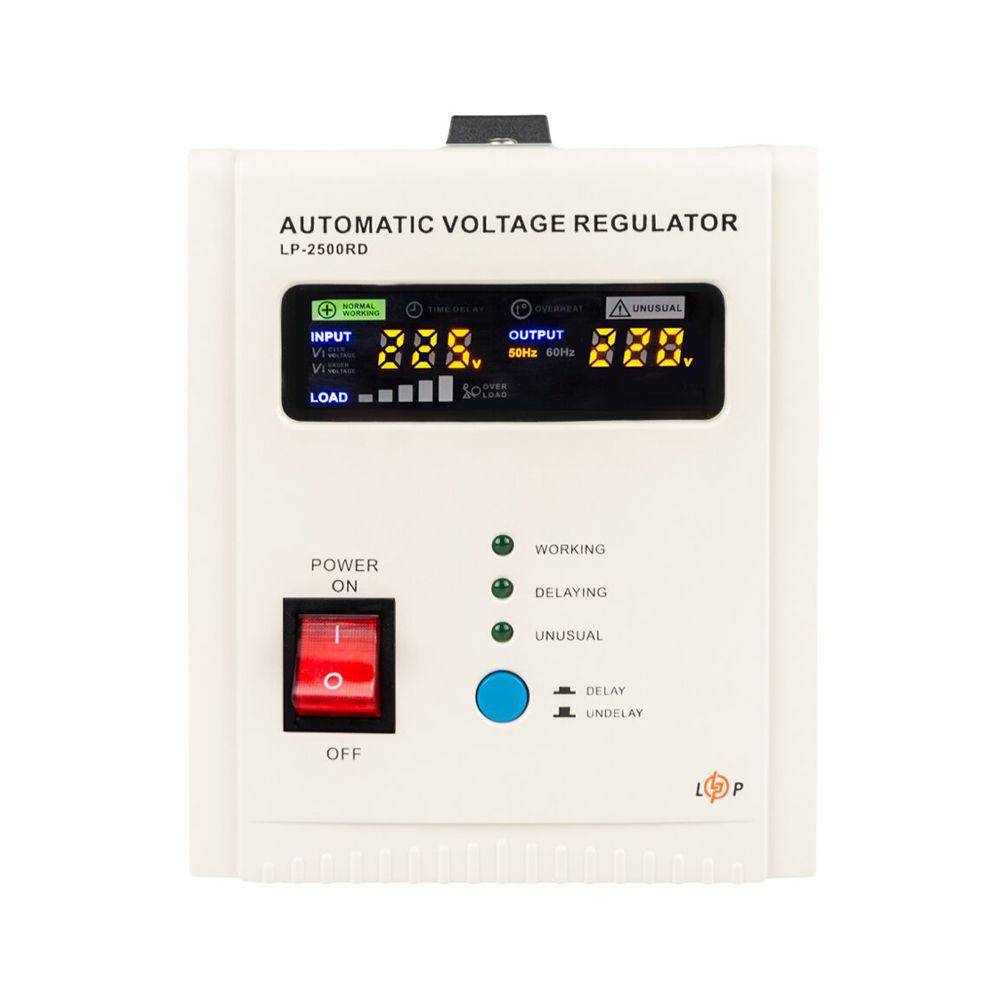 Logicpower LP-2500RD – однофазний релейний стабілізатор потужністю 1500 Вт із семиступеневою системою регулювання. Підтримує стабільну вихідну напругу 220 В ±10% при вхідному діапазоні від 100 до 260 В. Оснащений двома євророзетками, функцією затримки ввімкнення від 6 до 180 секунд і LED-індикацією. Корпус виготовлено з металу. Система охолодження пасивна. Тип установки підлоговий. Захист від перенапруги, зниженої напруги, перевантаження, короткого замикання.