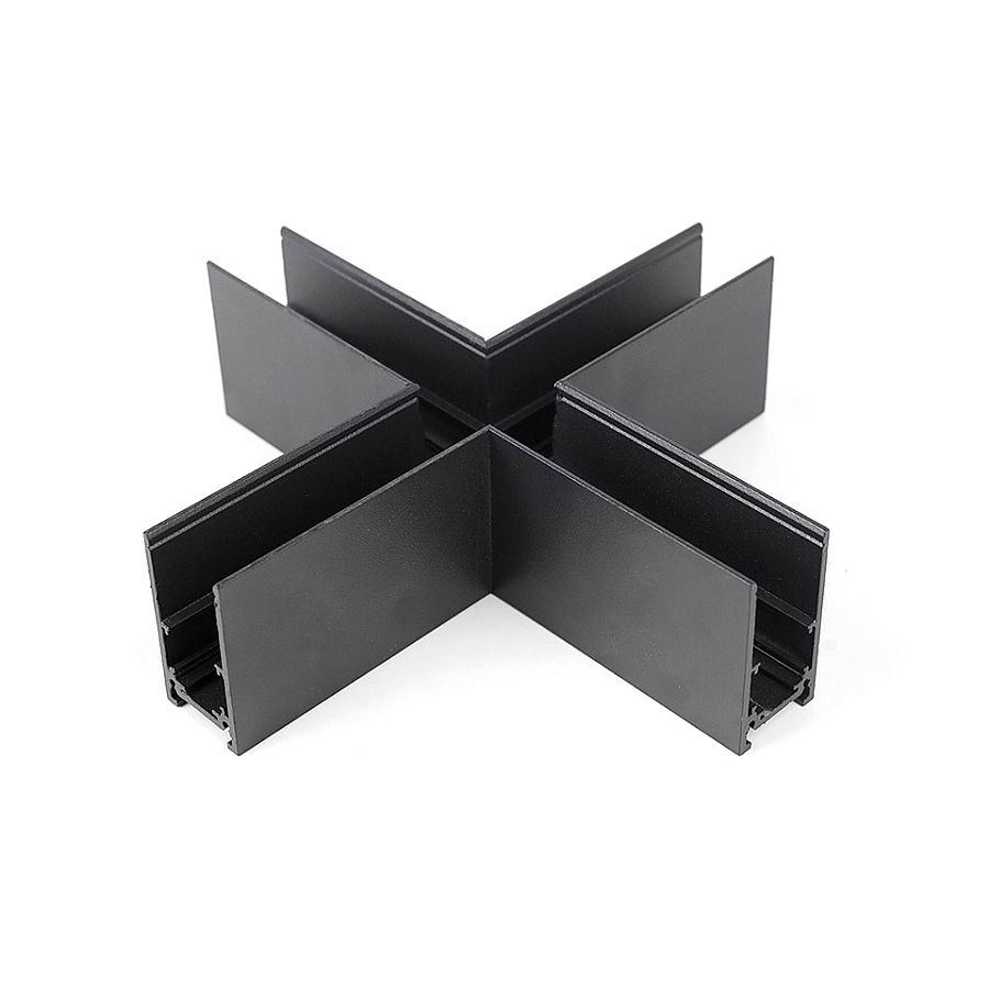 З'єднувач X-подібний для підвісних та накладних магнітних треків. Розмір профілю (Ш × В): 26.8 × 51 мм. Матеріал: алюмінієвий сплав. Колір: чорний