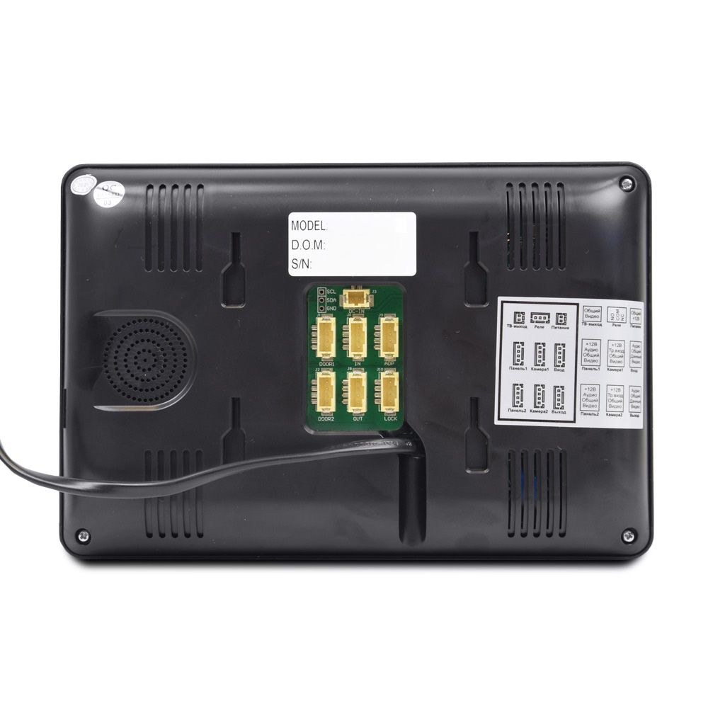 Комплект відеодомофон+відеопанель. Кольоровий домофон з IPS екраном 7 дюймів та сенсорними кнопками, підключення 2 панелей виклику AHD/TVI/CVI або CVBS, 2 відеокамер AHD/TVI/CVI або CVBS з роздільною здатністю до 2Мп, 2 датчиків тривоги і 1 додаткового монітора (телевізора). Розмова через гучний зв'язок. З'єднання з панеллю виклику 4-дротове. Слот microSD, живлення 100-240V, споживання 700mA, в режимі очікування 300mA. Корпус чорного кольору. Розміри 190х127х22 мм. Кольорова накладна відеопанель чорного кольору з CMOS матрицею і камерою з роздільною здатністю Full HD 1920x1080. Кут огляду 120°. 4-х дротове підключення до домофона. Підключення всіх типів електрозамків (NO/NC). Робоча температура -30..+50°С. Живлення від домофона DC12V. Розмір 130x48x19мм.