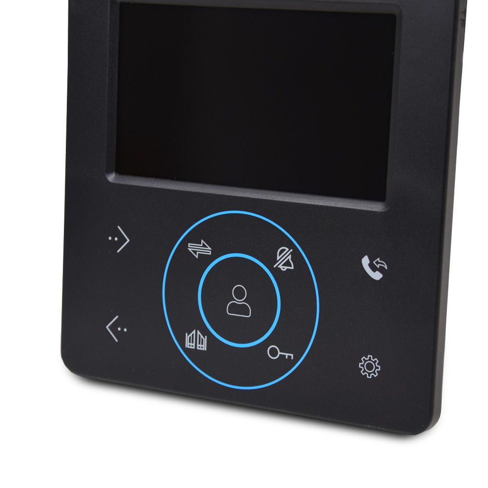 Кольоровий домофон з TFT екраном 4 дюйми і сенсорними кнопками керування, підключення 2 панелей виклику. Розмова по гучному зв'язку, є інтерком. З'єднання з панеллю виклику 4-дротове. Живлення 100-240V, споживання 8Вт. Корпус чорного кольору.
