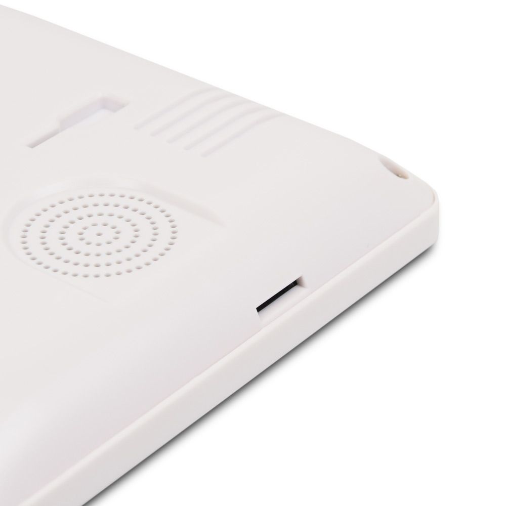 Кольоровий домофон з TFT екраном 7 дюймів і сенсорними кнопками керування, підключення 2 панелей виклику, 2 відеокамер, 2 датчиків тривоги. Розмова по гучному зв'язку, є датчик руху, інтерком. З'єднання з панеллю виклику 4-дротове. Слот microSD до 32 Гб, живлення 100-240V, споживання 8Вт. Розміри 190 х 125 х 22 мм. Корпус білого кольору.