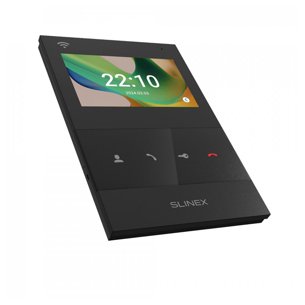 Кольоровий домофон з IPS екраном 4.3 дюйми з Wi-Fi, підключення 2 панелей виклику і 2 відеокамери будь-якого стандарту (AHD, TVI, CVI, CVBS), інтерком на 3 відеодомофони. Переадресація дзвінка на Slinex Smart Call. Розмова по гучному зв'язку. Слот microSD до 256 Гб, джерело живлення 100-240V, споживання 6 Вт. Корпус чорного кольору. Розміри: 119 х 175 х 21 мм. Робоча температура: -10 ... + 55˚C.
