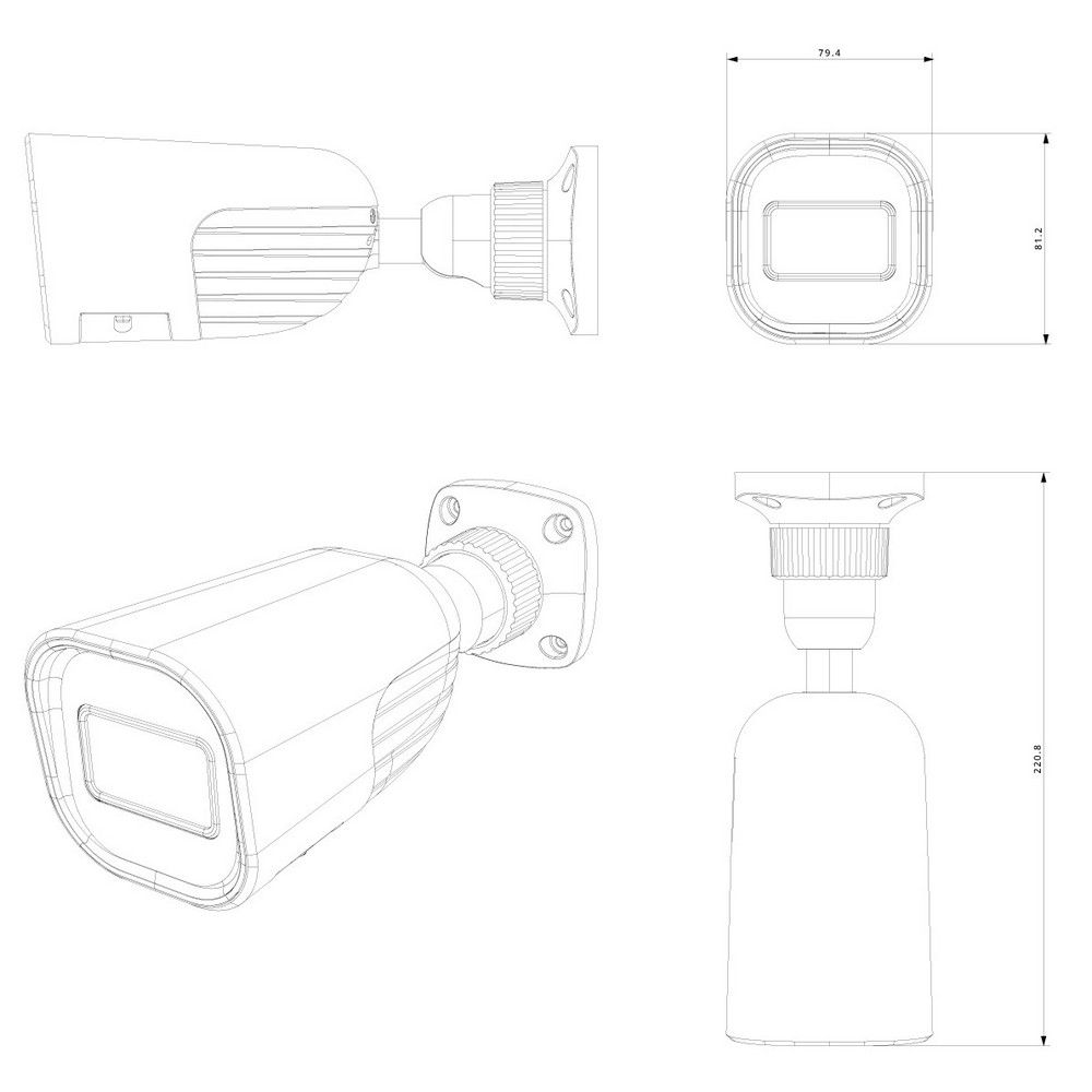 2 Мп IP відеокамера з LED підсвічуванням; Матриця: 1/2.8" CMOS; Стиснення: Н.265 / Н.265+ / H.264 / H.264+ / MJPEG; Об'єктив: f=3.6 мм (кут огляду 84.6°); Чутливість: 0 Люкс з видимим світлом; Запис: 2Мп (1920×1080) 25-30 к/с; Функції: True WDR (120dB), день/ніч(ICR), 3D-DNR, ROI, BLC, HLC; Кольорова картинка 24/7. Вбудований мікрофон, 1 аудіовхід; Підсвічування до 40 м; microSD до 128 Гб; IP67; DC 12В / PoE, 220.8x79.4x81.2 мм, 650 г