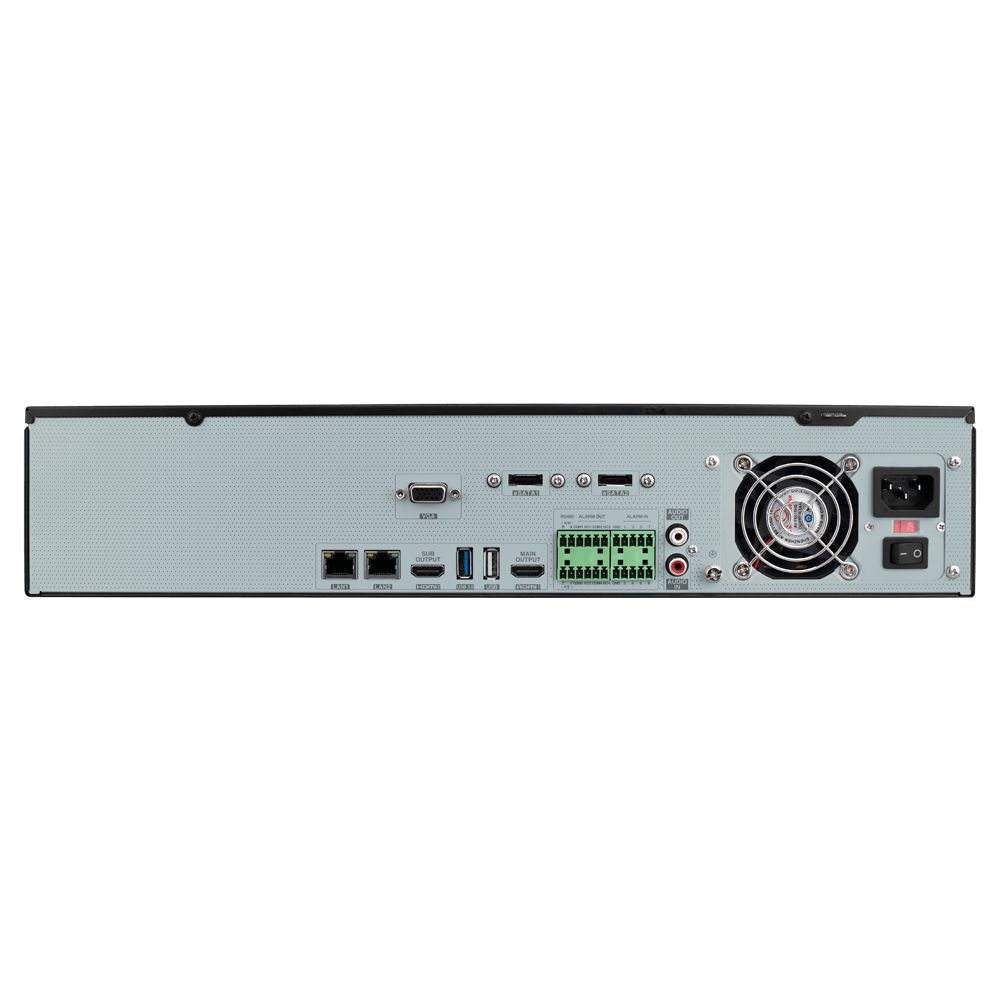 32-канальний NVR; H.265 / H.265+ / H.264 / H.264+ / MPEG4; Вхідний потік 320 Мб/с, запис: 1 канал – 12Мп ; 4 канали – 4Мп ; 9-32 каналів – D1; Відеовиходи: 2x HDMI, VGA; Аудіо: 1/1, Тривога: 8/4, 2 х RJ-45 10/100/1000 Мбіт/с, Відеоаналітика: розпізнавання облич, захист периметра. RS-485, 2x USB 2.0; 1x USB 3.0; 8 х HDD SATA до 10 ТБ, 2 х E-Sata, AC100-240В / 30Вт, 445 x 436 x 90 мм