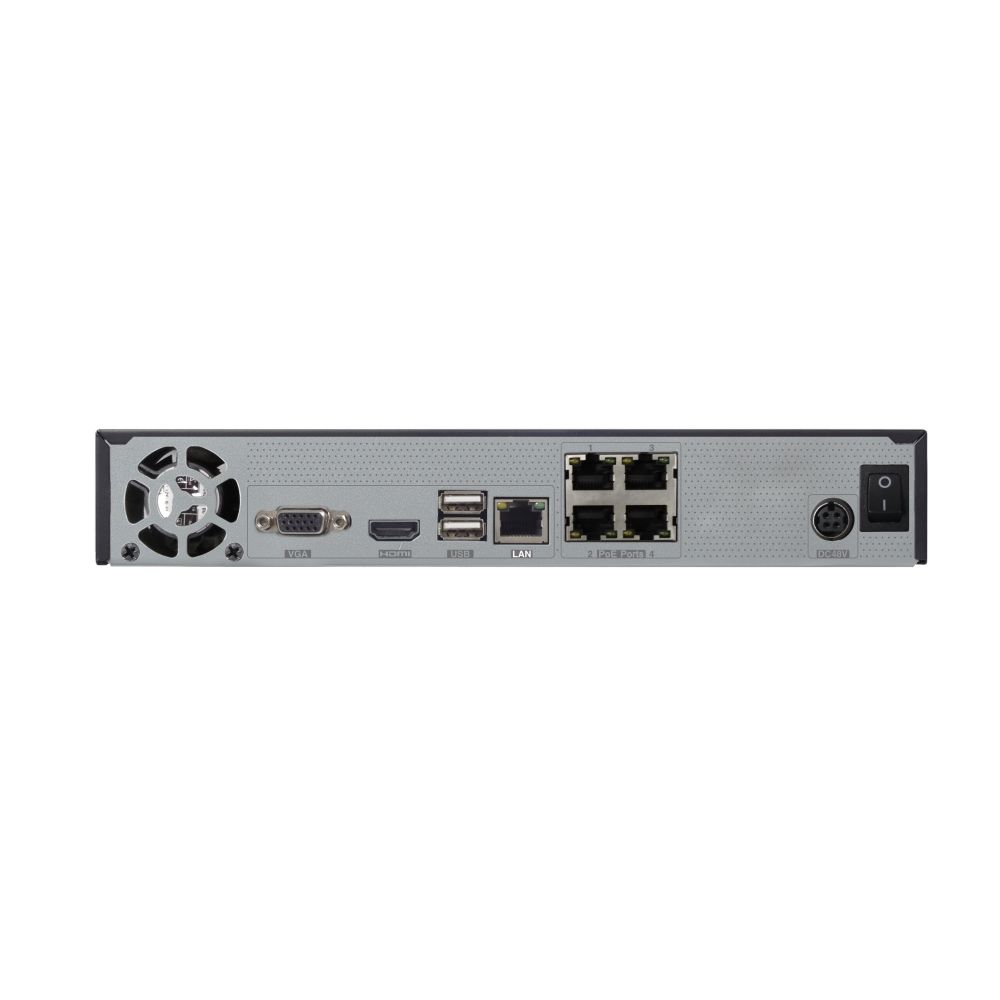 4-канальний мережевий відеореєстратор з PoE комутатором; H.265+ / H.265 / H.264+ / H.264; Вхідний потік 40 Мб/с, запис: 4 канали – 5Мп; Відео виходи: HDMI, VGA; Відеоаналітика: розумний пошук, перетин лінії. RJ-45 (10/100M); PoE комутатор на 4 порти (802.3 at/af), 2 х USB, 1х HDD до 6ТБ, DC 48В, 1.25 A / 5Вт, 255х220х45 мм