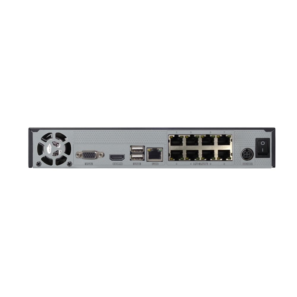 8-канальний мережевий відеореєстратор з PoE комутатором; H.265+ / H.265 / H.264+ / H.264; Вхідний потік 64 Мб/с, запис: 8 каналів – 5Мп; Відео виходи: HDMI, VGA; Відеоаналітика: розумний пошук, перетин лінії. RJ-45 (10/100M); PoE комутатор на 8 портів (802.3 at/af), 2 х USB, 1х HDD до 6ТБ, DC 48В, 1.25 A / 5Вт, 255х220х45 мм