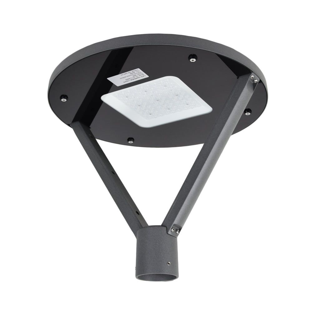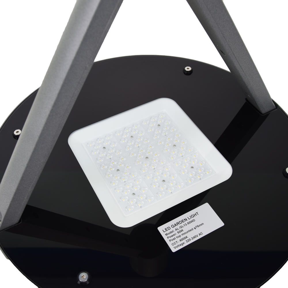 Світильник світлодіодний парковий. Потужність: 50 Вт. Джерело живлення: 220-240 В. Спосіб монтажу: на стовп. Колірна температура: 4000К. Форма світлової поверхні: F(коло). Основа кріплення: дві планки. Діаметр стовпа: 76 мм.