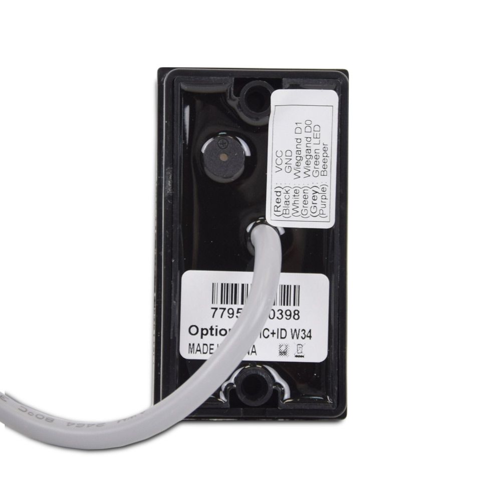 Зчитувач карт і брелоків стандарту Em-Marine 125кГц і Mifare 13.56 МГц, NFC міток вологозахищений; Wiegand; Дальність зчитування 10см; Живлення 6-14В; Споживання 70мА; IP65; Температура -10°C до +70°C; Розміри 77.5 x 42.8 x 16.5 мм